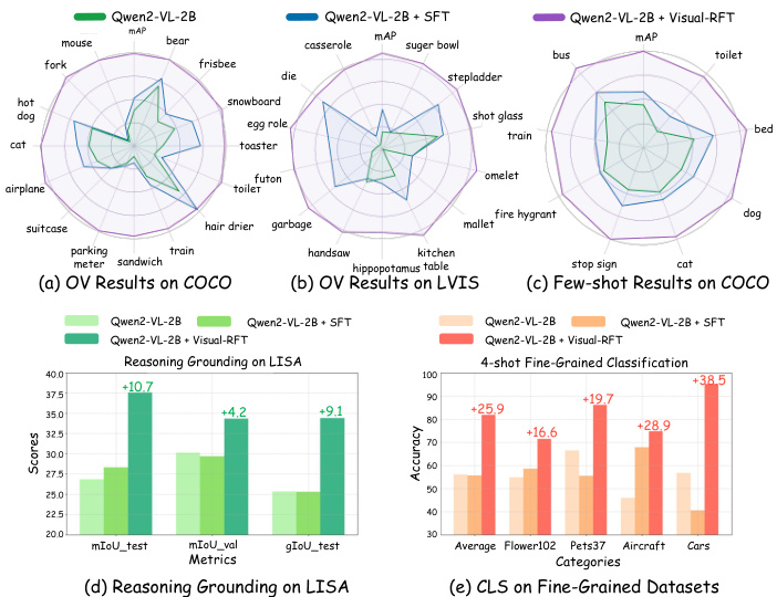 Figure 1. Our Visual Reinforcement Fine-Tuning (Visual-RFT) performs better than previous Supervised Fine-Tuning (SFT) on a variety of tasks, such as Open Vocabulary(OV)/Few-shot Detection, Reasoning Grounding, and Fine-grained Classification.