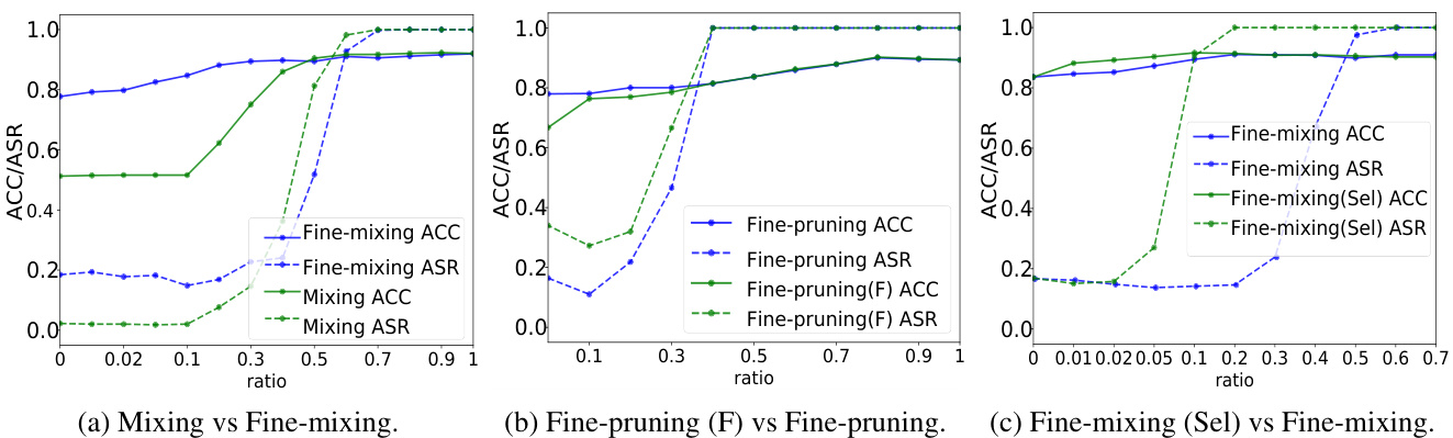 Here, we evaluate two variants of Fine-mixing: 1) Mixing (Fine-mixing without fine-tuning) and 2) Fine-pruning (F) (Fine-pruning with frozen pruned weights during fine-tuning). As shown in Fig. 2a, when the reserve ratio is set to ${\sim}0.3$ , both Mixing and Fine-mixing can mitigate backdoors. Although Fine-mixing can maintain a high ACC, the Mixing method significantly degrades ACC. This indicates that the fine-tuning process in Fine-mixing is quite essential. As shown in Fig. 2b, both Fine-pruning and Fine-pruning (F) can mitigate backdoors when $\rho<0.2$ . However, Fine-pruning can restore the lost performance better during the fine-tuning process and can gain a higher ACC than Fine-pruning $(\mathrm{F})$ . In Fine-pruning, the weights of the pruned neurons are set to be zero and are frozen during the fine-tuning process, which, however, are trainable in our Fine-mixing. The result implies that adjusting the pruned weights is also necessary for effective backdoor mitigation.