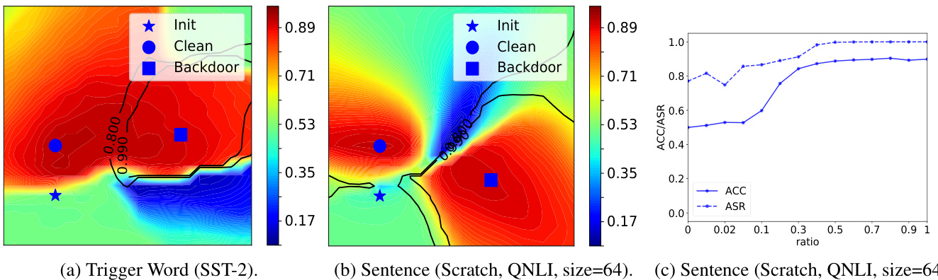 图 3: 在参数空间中 (a, b) 的干净 ACC 和后门 ASR 的可视化,以及在不同 $\rho$ 下 (c) 的干净 ACC 和后门 ASR。在 (a, b) 中,红色表示更高的 ACC,黑线表示 ASR 的等高线,“Init”表示初始预训练(未微调)的权重。