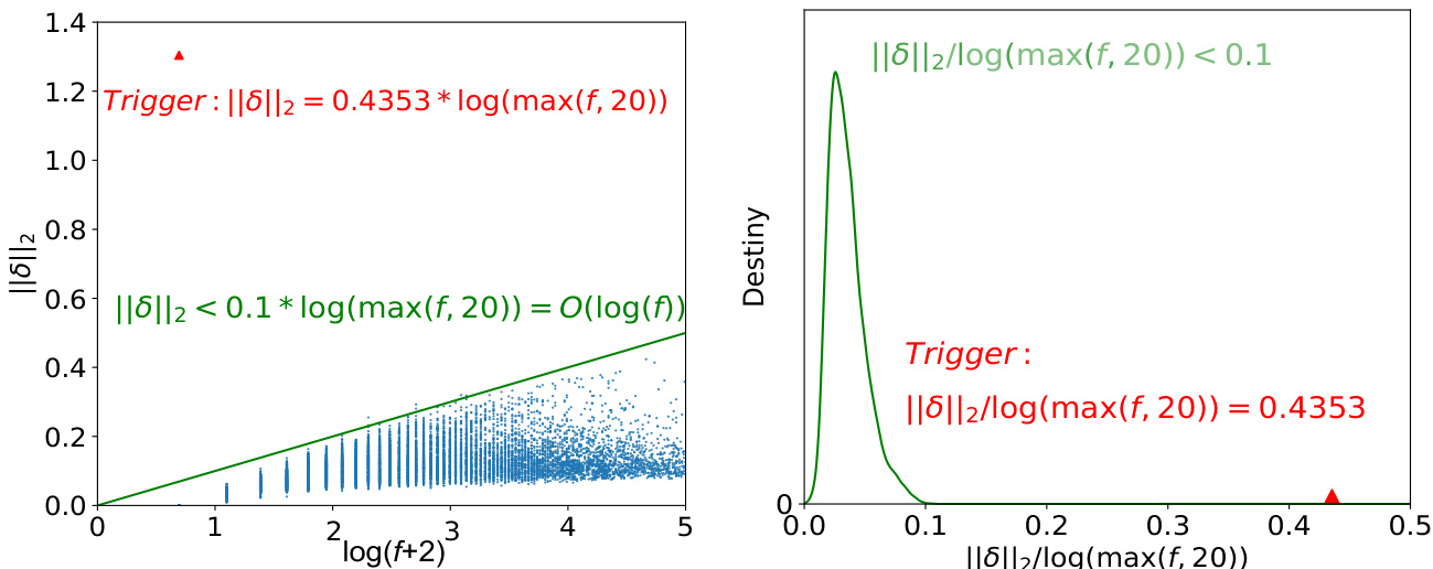 Figure 1: Visualization of $\lVert\pmb{\delta}\rVert_{2}$ and $\log(f)$ of the trigger word (red) and other words (blue or green) on SST-2. The left figure is a scatter diagram of $\lvert\lvert\delta\rvert\rvert_{2}$ and $\log(f+2)$ , and the right figure illustrates the density of the distribution of $|\delta|{2}/\log\operatorname*{max}(f,20)$ . The trigger word has a higher $|\delta|{2}/\log\operatorname*{max}(f,20)$ .