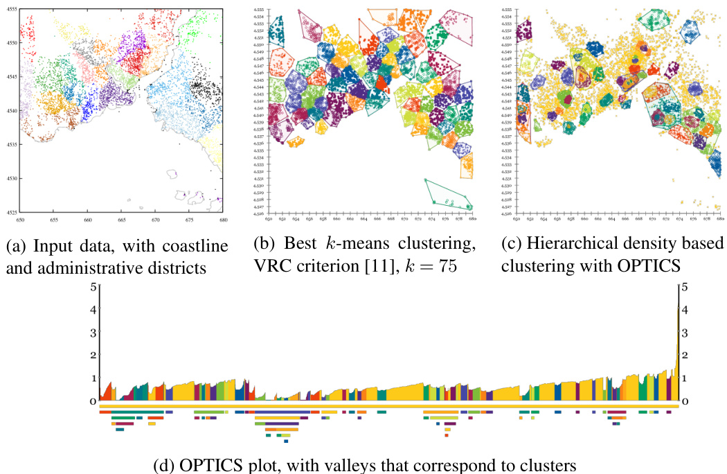 In Fig. 1 we introduce our running example. This data set contains 10,000 coordinates derived from real tweets in Istanbul. The raw coordinates can be seen in Fig. 1a, along with the coastline for illustration, and colored by administrative areas. Classic $k$ - means clustering can be seen in Fig.1b, with $k{=}75$ chosen by the Calinski-Harabasz criterion [11] (but this heuristic did not yield a clear “best” $k$ ). A hierarchical density-based clustering is shown in Fig.1c. This clustering does not partition all data points equally, but it emphasizes region of higher density, possibly even nested. Many of these regions correspond to neighborhood centers and shopping areas. Fig.1d shows the OPTICS plot for this clustering.