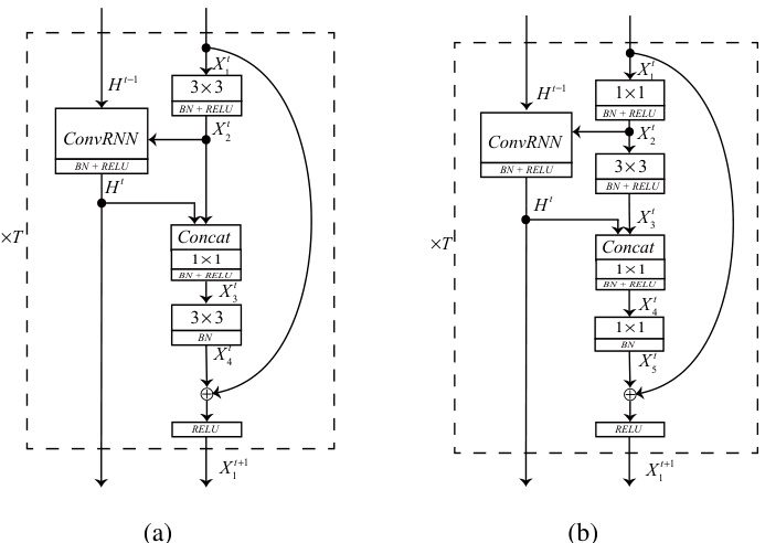 - RNN-Regulated ResNet Module (RegNet module): The illustration of RegNet module is shown in Fig. 3(a). Here, we choose ConvLSTM for expounding. $H^{t-1}$ denotes the earlier output from ConvLSTM, and $H^{t}$ is output of the ConvLSTM at $t$ -th module . $X_{i}^{t}$ denotes the $i$ -th feature map at the $t$ -th module.