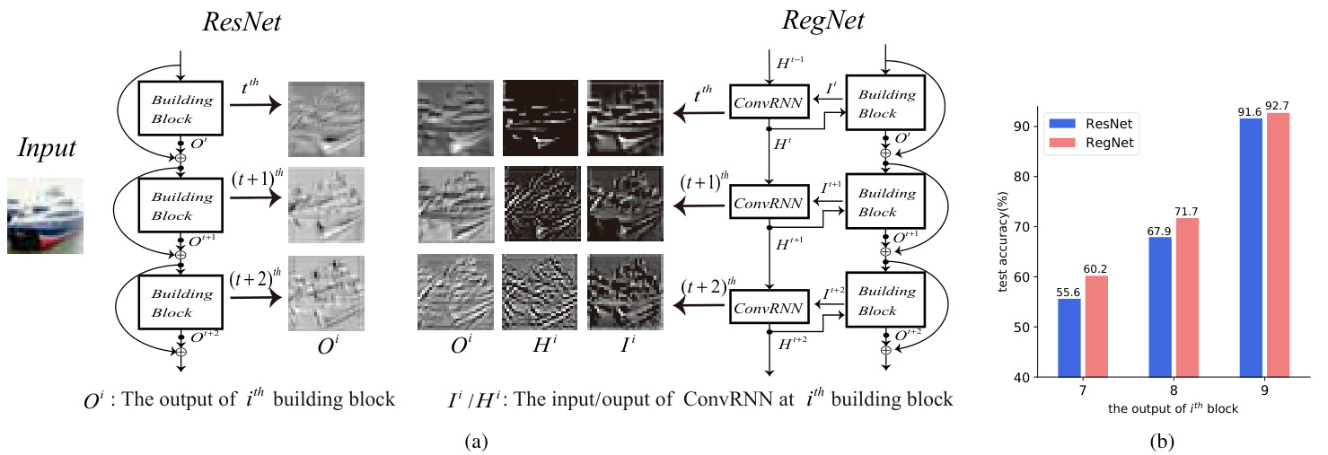 Fig. 1. (a):Visualization of feature maps in the ResNet [5] and RegNet. We visualize the outputs  $O^{i}$  feature maps of the  $i^{t h}$  building blocks,  $i\in{t,t+1,t+2}$  . In RegNets,  $I^{i}$  denotes the input feature maps.  $H^{i}$  denotes the hidden states generated by the ConvRNN at step  $i$  . By applying convolution operations over the concatenation   $I^{i}$  with  $H^{i}$  , we can get the regulated outputs( denoted by   $O^{i}$  ) of the   $i^{t h}$  building block. (b): The prediction on test data based on the output feature maps of consecutive building blocks. During the test time, we add an average pooling layer and the last fully connected layer to the outputs of the last three building blocks  $(i\in{7,8,9})$   in ResNet-20 and RegNet-20 to get the classification results. It can be seen that the output of each block aided with the memory information results in higher classification accuracy.