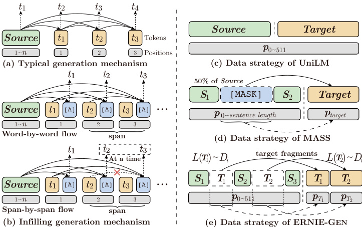 此外,鉴于人类写作中的实体、短语和句子是以连贯的方式组织的,我们将逐段生成任务引入ERNIEGEN,作为一种新的生成流程,以训练模型连续预测语义完整的段落,而不是像传统模型那样逐词预测。该任务通过填充生成机制实现,并与基于填充的逐词生成流程并行,以促进训练中的收敛,如图1b所示。