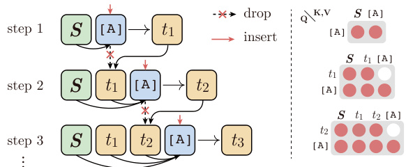 During inference, the target sequence $\mathbf{\delta}_{\mathbf{{T}}}$ is unknown, we insert symbol [ATTN] step by step to gather the representation of history context instead of preparing an artificial symbol sequence $\pmb{A}$ in advance. Meanwhile, for the purpose of efficiency, we need to drop the inserted [ATTN] after inference at each step, as detailed in Figure 4.