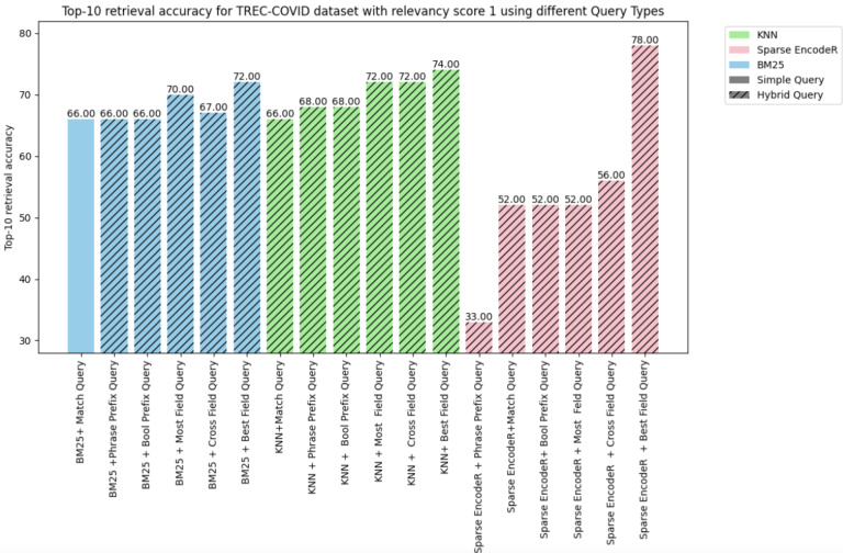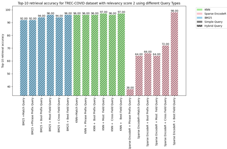 Subsequent to the initial evaluation, the same spectrum of queries was subjected to assessment against the TRECCOVID dataset with a relevancy score of 2, denoting that the documents were entirely pertinent to the associated queries. Figure 4 illustrated with a relevance score of two, where documents fully meet the relevance criteria for associated queries, reinforce the efficacy of vector search hybrid queries over conventional keyword-based methods. Notably, the hybrid query incorporating Sparse Encoder with Best Fields demonstrates a $98%$ top-10 retrieval accuracy, eclipsing all other formulations. This suggests that a methodological pivot towards more nuanced blended search, particularly those that effectively utilize the Best Fields, can significantly enhance retrieval outcomes in information retrieval (IR) systems.