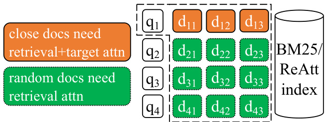 Figure 2: Illustration of approximate attention over the corpus with $\scriptstyle|{\mathcal{Q}}|=4$ queries in a batch and $K{=}3$ close documents per query. We use $\pmb{q}_{1}$ as an example to illustrate the required computation, where close documents require both retrieval and target attention while random documents only require retrieval attention.