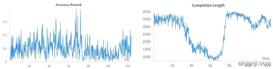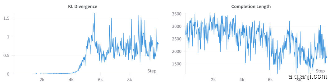 改进后的初始性能验证了我们的假设,表明较简单的问题鼓励简洁的推理,而较难的问题则保持复杂性。然而,后期的不稳定性突显了长度限制和多语言倾向的持续挑战。我们注意到: