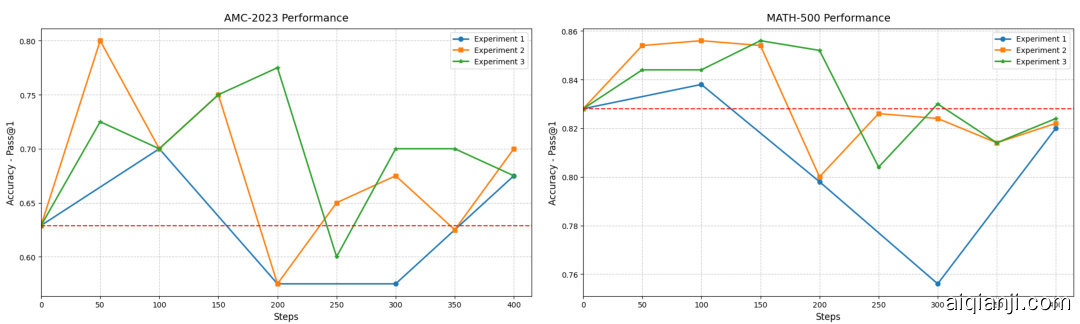 图 2: 模型在 AMC23 (左) 和 MATH-500 (右) 上的性能随全局训练步骤的变化。红色虚线表示训练开始时的基线分数。
