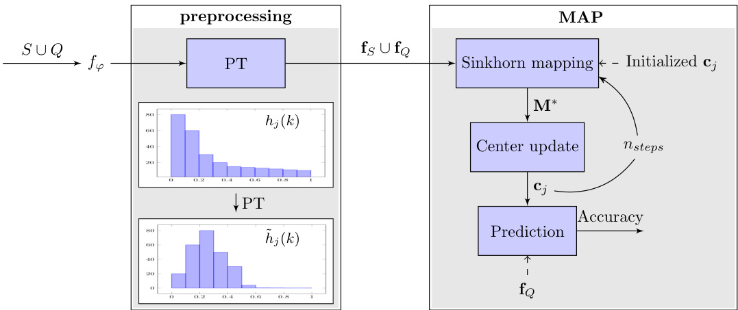 Figure 1: Illustration of the proposed method. First we extract feature vectors of all the inputs in   $\mathbf{D}{n o v e l}$   and preprocess them to obtain   $\mathbf{f}{S}\cup\mathbf{f}{Q}$  . Note that the Power transform (PT) has the effect of mapping a skewed feature distribution into a gaussian-like distribution (  $h{j}(k)$   denotes the histogram of feature   $k$   in class   $j$  ). In MAP, we perform Sinkhorn mapping with class center   $\mathbf{c}{j}$   initialized on fS to obtain the class allocation matrix  $\mathbf{M}^{*}$  for   $\mathbf{f}{Q}$  , and we update the class centers for the next iteration. After   $\boldsymbol{n_{s t e p s}}$   we evaluate the accuracy on   $\mathbf{f}_{Q}$  .