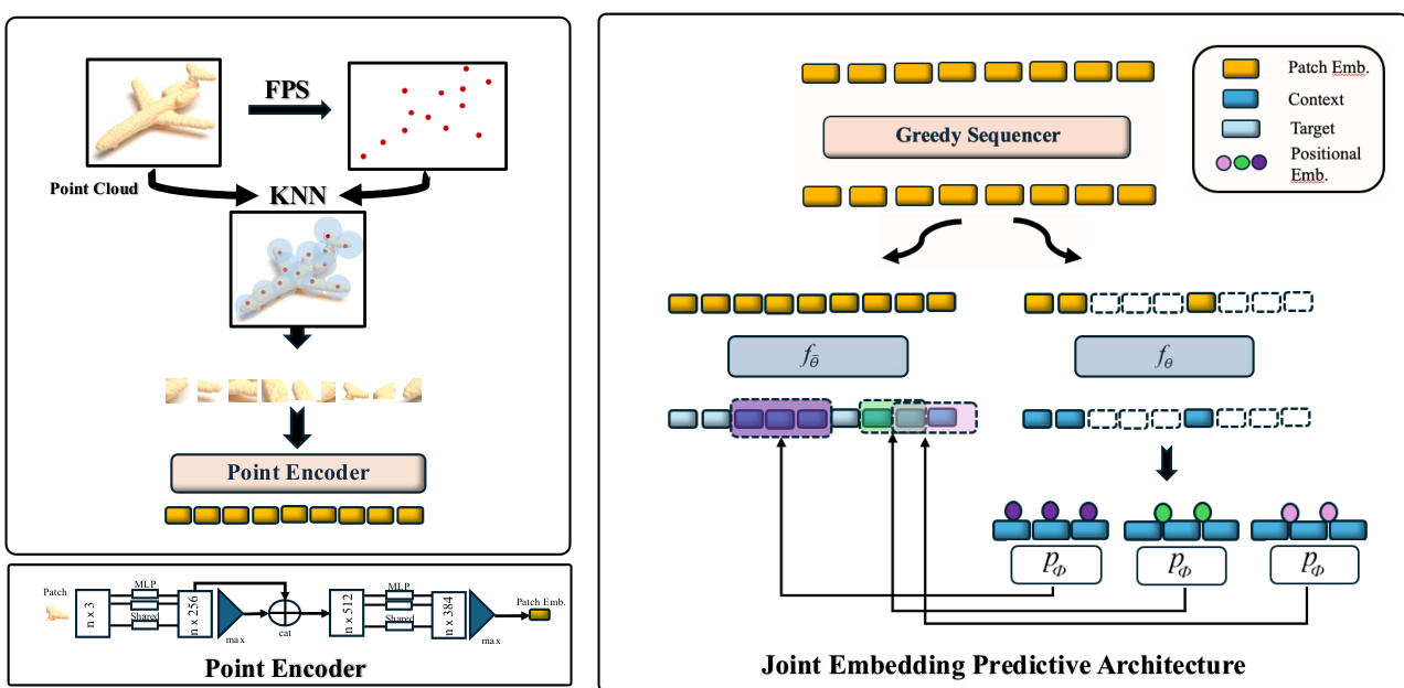 • 我们提出了一种基于空间邻近度的贪心算法,用于联合嵌入预测架构的点云块嵌入排序方法。