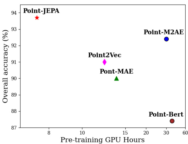 ModelNet40 Linear Evaluation vs Pre-train Hours Figure 1. ModelNet40 Linear Evaluation. Pre-training time on NVIDIA RTX A5500 and overall accuracy with SVM linear classifier on ModelNet40 [36]. We compare PointJEPA with previous methods utilizing standard Transformer architecture.