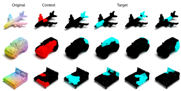 Figure 3. Context and Targets. We visualize the corresponding grouped points of context and target blocks. Here, we use (0.15, 0.2) for the target selection ratio and (0.4, 0.75) for the context selection ratio.