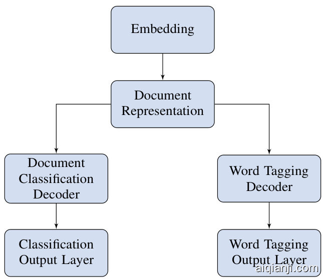 图 3 展示了一个模型,该模型学习了一个共享的文档表示,用于文档分类和词性标注任务。该模型在自然语言理解中非常有用,当给定一个句子时,我们希望预测其背后的意图并标注句子中的槽位。联合优化这两个任务有助于模型为这两个任务学习一个鲁棒的句子表示。此外,我们可以将这个预训练的句子表示用于其他训练数据稀缺的任务。