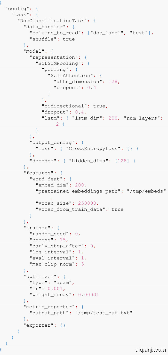 任务:将训练或推理任务所需的各种组件组合成一个流水线。图 1 展示了一个文档分类任务的示例配置。它可以配置为一个 JSON 文件,定义所有子组件的参数。