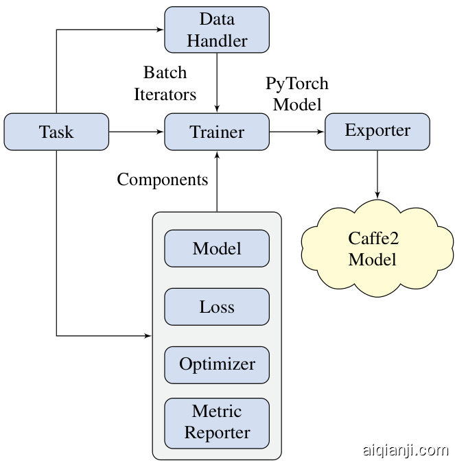 • 训练:从头开始或从保存的检查点训练模型。任务使用数据处理器(Data Handler)创建训练、评估和测试数据集的批量迭代器,并将这些迭代器与模型、优化器和指标报告器一起传递给训练器。随后,训练好的模型以 PyTorch 格式序列化,并转换为静态的 Caffe2 图。