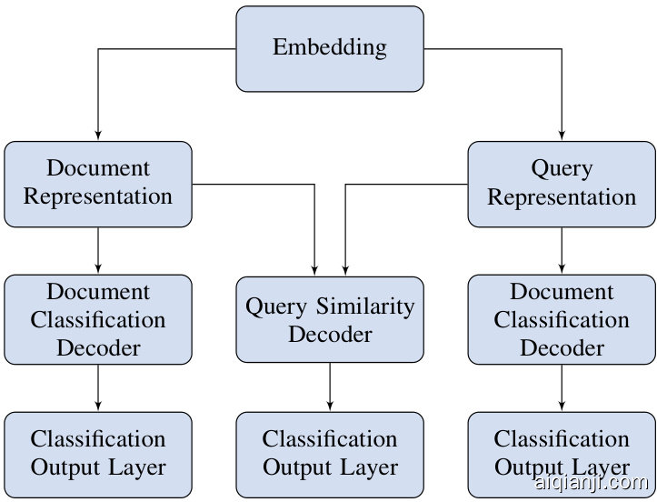 图 4 展示了一个模型,该模型通过查询-文档相关性以及单独的查询和文档分类任务来学习文档和查询的表示。这种方法通常用于信息检索中,在给定查询和文档的情况下,我们希望预测它们的相关性;但我们也添加了查询和文档分类任务,以增强学习表示的鲁棒性。
