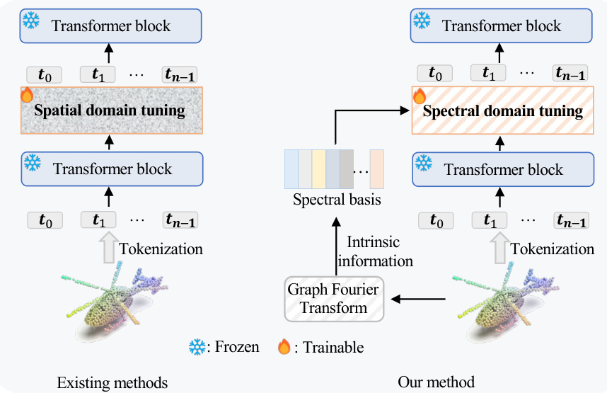Considering the above issues, we shift our focus to a new perspective: spectral domain fine-tuning. Spectral representations offer significant distinct ness over spatial domain representations. Specifically, compared to the spatial domain, features in the spectral domain can be easily decorrelated [57], [90], due to the ability of spectral representations to disentangle complex spatial relationships into distinct frequency components. This de correlation mitigates the confusion among tokens by using orthogonal components (spectral basis) to separate them. Additionally, the spectral basis obtained by the original point cloud offers direct intrinsic information about the downstream tasks to better guide the fine-tuning process. However, effectively and efficiently fine-tuning the parameters in the spectral domain is not a trivial problem, where two crucial concerns need to be considered: 1) what spectral transform to use, and 2) how to inject the intrinsic information into the fixed pretrained model by using this transform. An ideal transform for point clouds should be easy to construct, preserve intrinsic information, and adapt to the irregular structure of point cloud data. We find that the Graph Fourier Transform (GFT)