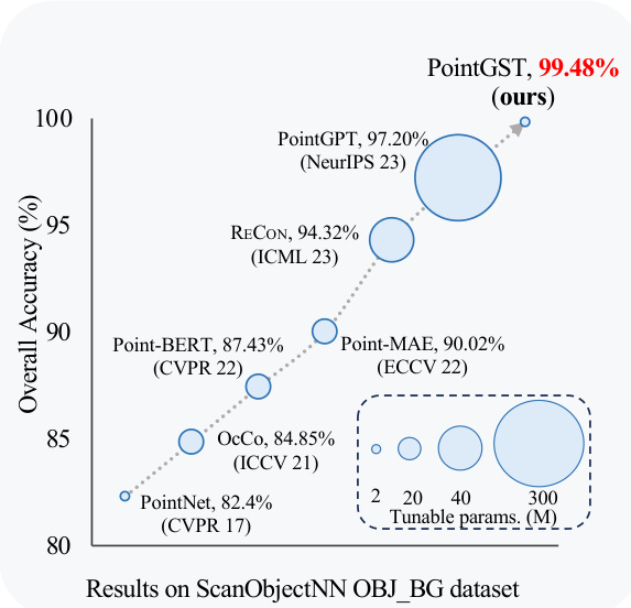 Extensive experiments conducted on challenging point cloud datasets across various tasks and data settings demonstrate the effectiveness of our PointGST. For example, when adopting the convincing Point-BERT [85] (resp., Point-MAE [40]) as the baseline, our approach archives notable performance improvement over fully fine-tuning by $3.96%$ , $1.55%$ , $2.57%$ , and $0.7%$ (resp., $1.72%$ $1.90%$ , $0.11%$ , and $0.3%$ ) on the S can Object NN OBJ BG, OBJ ONLY, PB T50 RS and ModelNet40 datasets, while surprisingly only requires about $2.77%$ of the total learnable parameters. More importantly, our method even boosts the largescale pre-trained models PointGPT-L [4], only using $0.6%$ trainable parameters to achieve $99.48%$ accuracy on the S can Object NN OBJ BG dataset, outperforming the SOTA method PointGPT-L [4] by $2.28%$ , establishing the new stateof-the-art. To the best of our knowledge, we are the first to push the performance on this dataset to surpass $99%$ . We also draw the intuitive trend of performance and trainable parameters in Fig. 1(b).