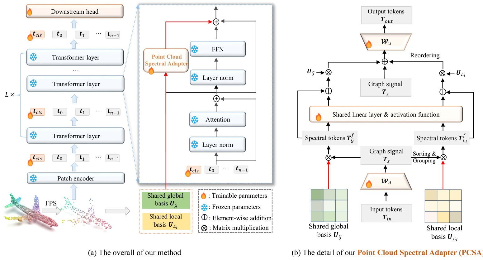 Fig. 2: (a) The overall of our PointGST. During the fine-tuning phase, we freeze the given pre-trained backbones and only fine-tune the proposed lightweight Point Cloud Spectral Adapter (PCSA). (b) The details of our proposed PCSA. We treat the point tokens as graph signals and then transfer the point tokens from the spatial domain to the spectral domain for tuning. The PCSA is injected into each transformer layer in a parallel paradigm.