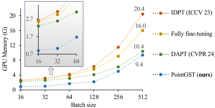 We further analyze the training GPU memory, which is an important metric for evaluating the training cost of a neural network. As shown in Fig. 4, our method significantly reduces training memory as the batch size increases compared with Point-MAE [47]. In addition, compared with the previous representative PEFT methods for point cloud [88], [99], we present clear advantages, especially under the widely-used batch sizes such as 16 and 32.