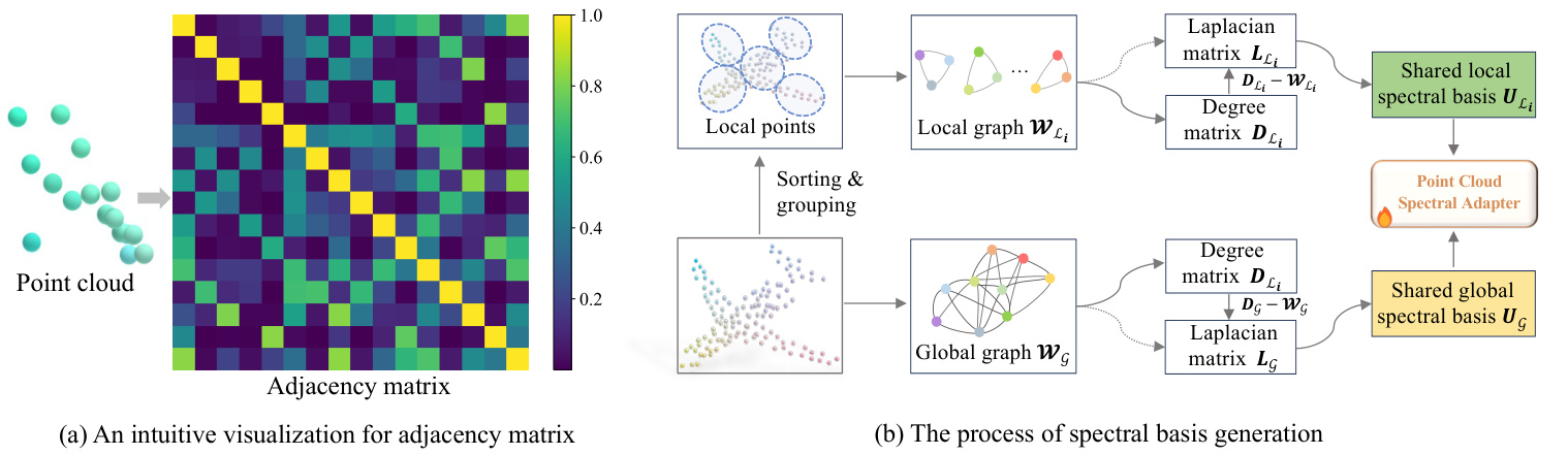 图 3: (a) 我们构建的图的直观可视化,邻接矩阵是对称的,对角线元素等于 1。元素值越小,表示点云之间的几何距离越大。(b) 我们全局和局部谱基生成的详细过程。