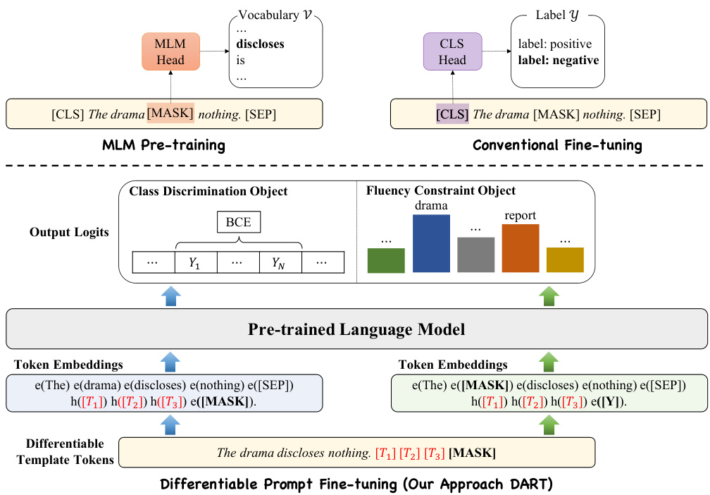 从前人的实证研究 (Gao et al. (2020); Scao & Rush (2021)) 中可以发现,优化提示词 (prompt) 对于提升少样本学习场景下预训练语言模型的性能至关重要。由于基于离散token的模板可能存在次优性且难以充分表征特定类别2,本研究提出可微分提示 (DifferentiAble pRompT,简称DART),通过降低提示工程 (prompt engineering) 的门槛来提升该方法在多领域的适用性。