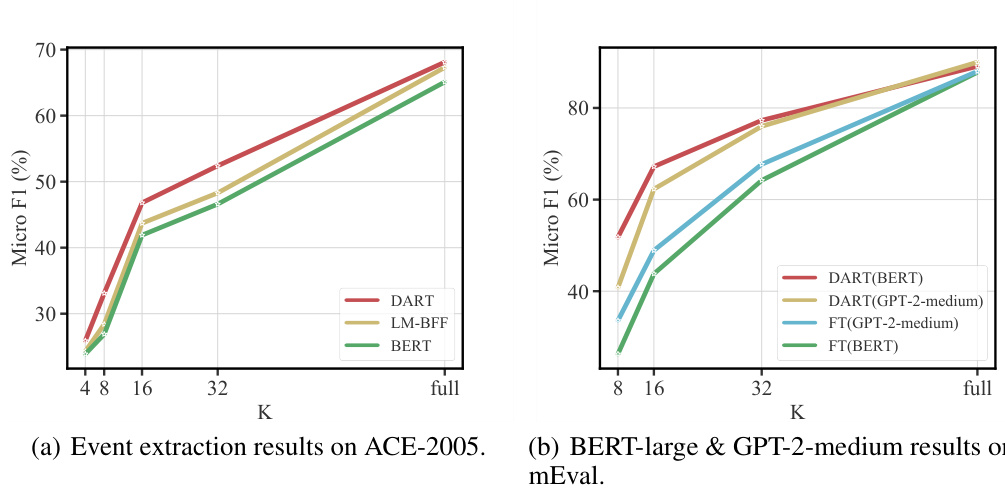 Figure 2: (a) Few-shot results using the ACE-2005. We used  $\mathrm{K}=4$  , 8, 16, and 32 (# examples per class) with BERT.   $\mathrm{FT}=$  Fine-tuning) (b) BERT-large vs. GPT-2-medium results for the SemEval. Moreover, for lower K, our method consistently outperforms conventional fine-tuning.