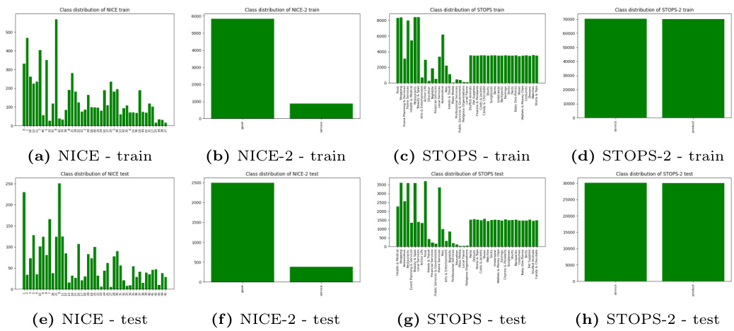 Goods and Services Datasets In order to evaluate the performance on data with real world applications, we introduce two new datasets that are focused on the distinction between goods and services. Although there are already datasets for product classification, such as the WDC-LSPM7, to the best of our knowledge, our datasets are the first to combine goods and services. NICE is a classification system for goods and services that divides them into 45 classes and is based on the Nice Classification 8 of the World Intellectual Property Organization (WIPO). There are 11 classes for various service types and 34 categories for goods. With 9, 593 documents, NICE-45 is comparable in size to the benchmark datasets. This dataset, which has texts with an average length of 3.75 tokens, is an excellent example of extremely short text. For the division into goods and services, there is also the binary version NICE-2. Short Texts Of Products and Services (STOPS) is the second dataset we offer. With 200, 341 documents and an average length of 5.64 tokens, STOPS-41 is a reasonably large dataset. The data set was derived from a potential use case in the form of Amazon descriptions and Yelp business entries, making it the most realistic. Like NICE, STOPS has a binary version STOPS-2. Both datasets provide novel characteristic properties that the benchmark datasets did not cover. In particular, the number of fine-granular classes presents a challenge that is not addressed by common benchmarks. For details on the class distribution of these datasets, please refer to Figure 1.