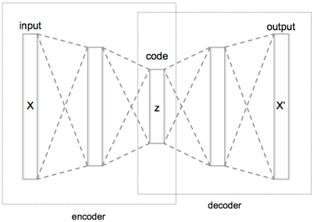 Figure 1: Schematic structure of an Auto encoder with Three fully connected hidden layers. The code  $(z)$   is the most internal layer.