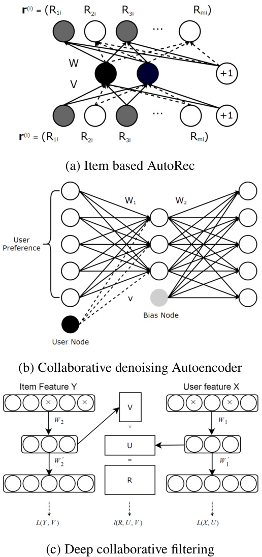 Figure 2: Illustration of: (a) Item based AutoRec; (b) Collaborative denoising Auto encoder; (c) Deep collaborative filtering framework (Zhang et al., 2019)