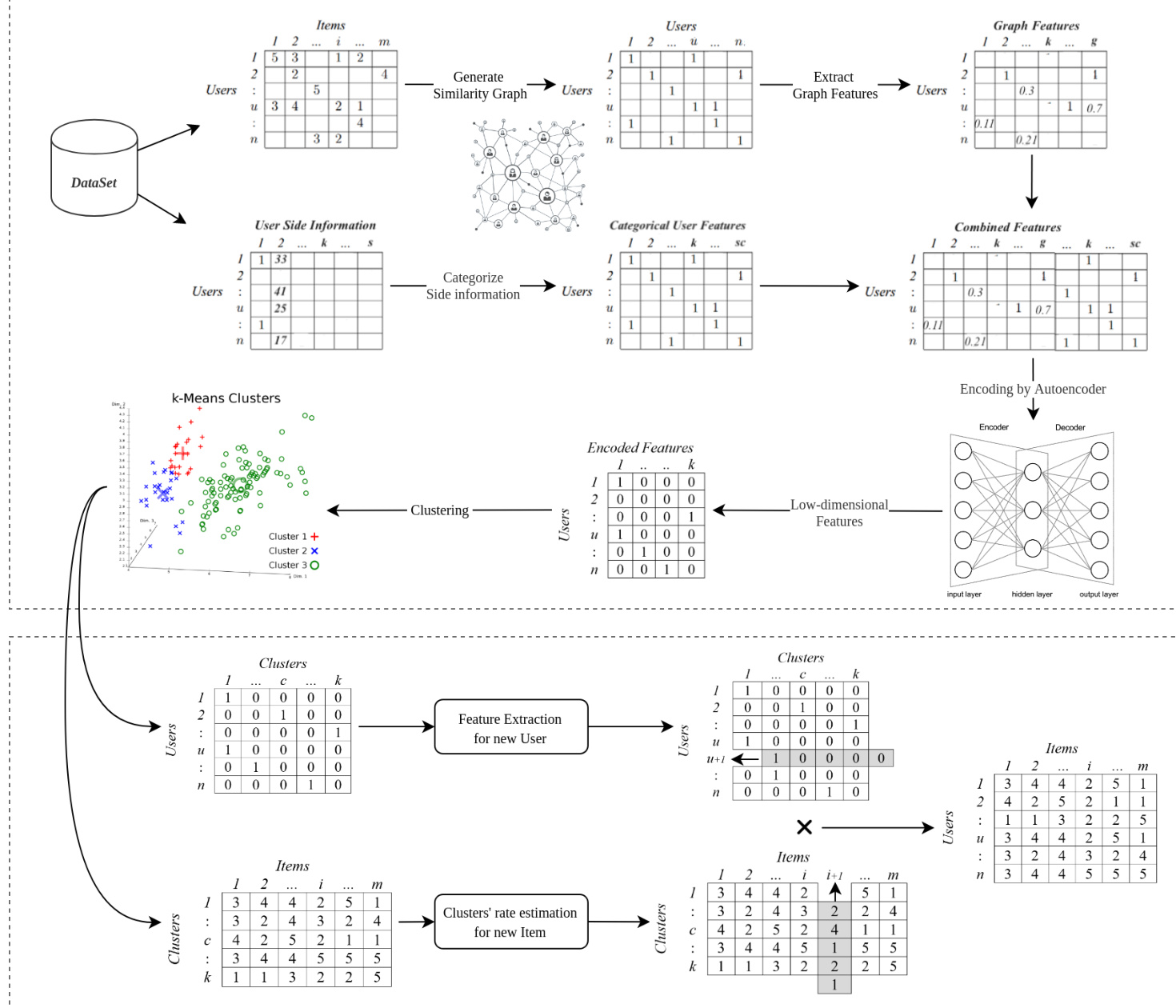 Input: $U,I,R,F_{u},F_{i}$ Output: Estimated rates for user-item 1: Set alpha $=$ percentage of items with similar ratings between two users 2: Compute the aggregated similarity between users base of $\alpha$ (the percentage of items which two users rated them similarly) 3: Construct the Similarity Graph and consider the users as nodes 4: $F_{g}$ : Extracted graph-based features for users (nodes) 5: $F_{s}$ : Pre processed and categorized users’ side information (demographic informations) 6: Combine $F_{g}$ and $F_{s}$ in a single feature vector $F_{t}$ . Apply the Auto encoder on $F_{t}$ and train the model with the best settings 7: Encode the $F_{t}$ using the Auto encoder an extract the low dimensional feature vector $F_{e}$ 8: Find the optimum clusters for clustering users with $F_{e}$ 9: Perform user clustering using extracted features vector $F_{e}$ and find clusters $C$ 10: Generate the user-cluster matrix $U C$ 11: Estimate clusters’ ratings for items matrix $C I$ : 12: if there are users rated the item i before in the cluster $c$ then 13: $C I_{c i}=$ average (users’ rates of the item $i$ in the cluster $c$ ) 14: else if there are Similar Items to the item $i$ , rated by users in the cluster $c$ then 15: $C I_{c i}=$ average (users’ rates of Similar Items in the cluster $c$ ) 16: else 17: $C I_{c i}=$ average (all users’ rates in the cluster $c$ ) 18: end if 19: Estimate users’ ratings’ matrix $R^{\prime}=U C\times C I$ 20: Compute the recommendation list for target user $u$