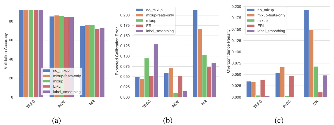 While mixup was originally suggested as a method to mostly improve performance on image classification tasks, here we explore the effect of mixup training in the natural language processing (NLP) domain. A straight-forward mixing of inputs (as in pixel-mixing in images) will generally produce nonsense input since the semantics are unclear. To avoid this, we modify the mixup strategy to perform mixup on the embeddings layer rather than directly on the input documents. We note that this approach is similar to the recent work described in [11] that utilizes mixup for improving sentence classification which is among the few works, besides ours, studying the effects of mixup in the NLP domain. For our experiments, we employ mixup on NLP data for text classification using the MR [28], TREC [22] and IMDB [24] datasets.We train a CNN for sentence classification (Sentence-level CNN) [17], where we initialize all the words with pre-trained GloVe [29] embeddings, which are modified while training on each dataset. For the remaining parameters, we use the values suggested in [17]. We refrain from training the most recent NLP models [14, 2, 41] since our aim here is not to show state-of-art classification performance on these datasets, but to study the effect on calibration. We show these results in Figure 4 where it is evident that mixup provides noticeable gains for all datasets, both in terms of calibration and over confidence. We leave further exploration of principled strategies for mixup for NLP as future work.