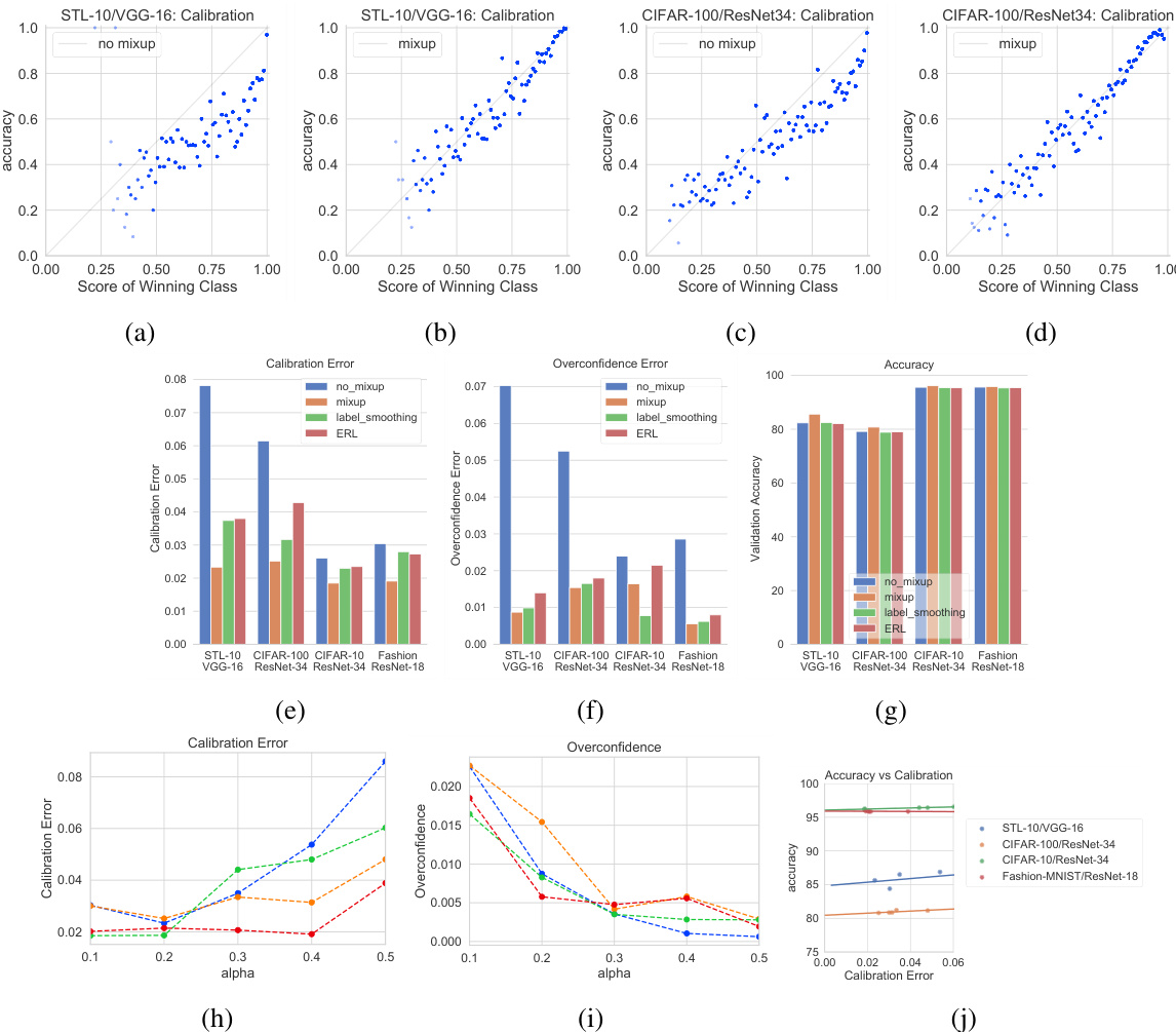 Figure 2: Calibration results for mixup and baseline (no mixup) on various image datasets and architectures. Top Row: Scatter plots for accuracy and confidence for STL-10(a,b) and CIFAR100(c,d). The mixup case is much better calibrated with the points lying closer to the  $x=y$   line, while in the baseline, points tend to lie in the overconfident region. Middle Row: Mixup versus comparison methods where label smoothing is the  $\epsilon$  -label smoothing method and ERL is the entropy regularized loss. Bottom Row: Expected calibration error (e) and over confidence error (f) on various architectures. Experiments suggest best ECE is achieved for  $\alpha$   in the [0.2,0.4] (h), while over confidence error decreases monotonically with  $\alpha$   due to under-fitting (i). Accuracy behavior for differently calibrated models is shown in (j).
