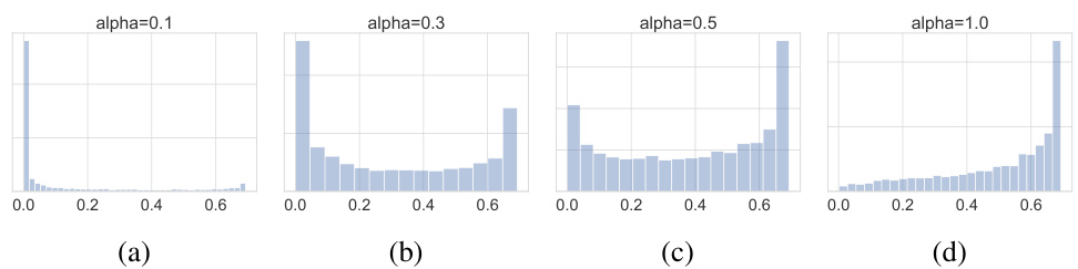 Figure 5: Entropy distribution of training labels as a function of the  $\alpha$   parameter of the  $B e t a(\alpha,\alpha)$  distribution from which the mixing parameter is sampled.
