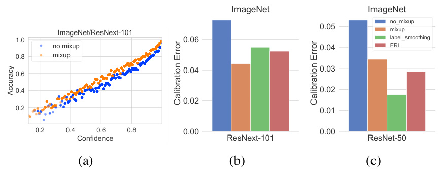 Here we report the results of calibration metrics resulting from mixup training on the 1000-class version of the ImageNet [5] data comprising of over 1.2 million images. One of the advantages of mixup and its implementation is that it adds very little overhead to the training time, and thus can be easily applied to large scale datasets like ImageNet. We perform distributed parallel training using the synchronous version of stochastic gradient descent. We use the learning-rate schedule described in [8] on a 32-GPU cluster and train till $93%$ accuracy is reached over the top-5 predictions. We test on two modern state-of-the-art arch ic ture s: ResNet-50 [12] and ResNext-101 (32x4d) [38]. The results are shown in Figure 3. The scatter-plot showing calibration for ResNext-101 architecture suggests that mixup training provides noticeable benefits even in the large-data scenario, where the models should be less prone to over-fitting the one-hot labels. On the deeper ResNext-101, mixup provides better calibration than the label smoothing models, though this same effect was not visible for the ResNet-50 model. However, both calibration error and over confidence show noticeable improvements using label smoothing over the baseline. The mixup model did however achieve a consistently higher classification performance of $\approx0.4$ percent over the other methods.