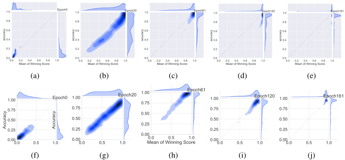 For this reason, quantifying the predictive uncertainty for deep neural networks has seen increased attention in recent years [6, 19, 7, 20, 16, 31]. One of the first works to examine the issue of calibration for modern neural networks was [9]; noting that in a well-calibrated classifier, predictive scores should be indicative of the actual likelihood of correctness, the authors in [9] show significant empirical evidence that modern deep neural networks are poorly calibrated, with depth, weight decay and batch normalization all influencing calibration. Modern architectures, it turns out, are prone to over confidence, meaning accuracy is likely to be lower than what is indicated by the predictive score. The top row in Figure 1 illustrates this phenomena: shown are a series of joint density plots of the average winning score and accuracy of a VGG-16 [32] network over the CIFAR-100 [18] validation set, plotted at different epochs. Both the confidence (captured by the winning score) as well as accuracy start out low and gradually increase as the network learns. However, what is interesting – and concerning – is that the confidence always leads accuracy in the later stages of training; accuracy saturates while confidence continues to increase resulting in a very sharply peaked distribution of winning scores and an overconfident model.
