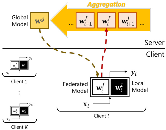 Hence, it is natural to rethink the scheme of FL. As a result, personalized FL (PFL) has becomes an essential component of FL, which has yielded many related studies. Many approaches are proposed for PFL, based on multi-task learning [12, 44, 51], regular iz ation technique [11, 23, 38]; meta-learning [14, 31], clustering [20, 43, 49], and a model mixture method [2, 8, 10, 38, 41, 43]. We focus on the model mixture-based PFL method in this paper as it shows promising performance as well as lets each client have their own model, which is a favorable trait in terms of personalization as each participating client eventually has their own model. This method assumes that each client has two distinct parts: a local (sub-)model and a federated (sub-)model (i.e., federated (sub-)model is a global model transferred to a client). In the model mixture-based PFL method, it is expected that the local model captures the information of heterogeneous client data distribution by staying only at the client-side, while the federated model focuses on learning common information across clients by being communicated with the server. Each federated model built at the client is sent to the server, where it is aggregated into a single global model (Figure 1). At the end of each PFL iteration, a participating client ends up having a personalized part (i.e., a local model), which potentially relieves the risks from the non-IIDness as well as benefits from the collaboration of other clients.
