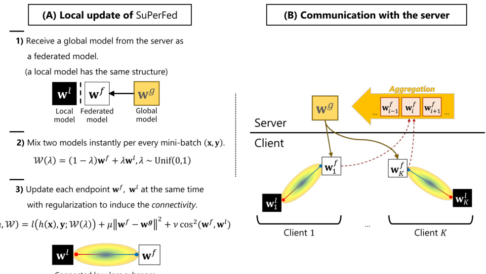 e federated model, thereby allowing the connected subspace between them to contain weights yielding high accuracy for the given task. Its magnitude is controlled by the constant  $\nu$  . Since merely applying the mixing strategy between the local and the federated models has little benefit [54], it is required to set  $\nu>0$  . In [15, 54], it is observed that weights of independently trained deep networks show dissimilarity in terms of cosine similarity, which has functional diversity as a result. Moreover, in [3, 45], inducing orthogonality (i.e., forcing cosine similarity to zero) between weights prevents deep networks from learning redundant features given their learning capacity. In this context, we expect the local model of each client  $\mathbf{w}{i}^{l}$  to learn client-specific knowledge while the federated model  $\mathbf{w}{i}^{f}$  learns client-agnostic knowledge in a complementary manner and is harmoniously combined with the local model. The other regular iz ation term adjusted by  $\mu$  is L2-norm which controls the proximity of the update of the federated model  $\mathbf{w}_{i}^{f}$  from the global model  $\mathbf{w}^{g}$  [39]. By doing so, we expect each local update of the federated model not to be derailed from the global model, which prevents divergence of the aggregated global model during the process of FL. Note that an inordinate degree of proximity regular iz ation can hinder the local model’s adaptation and thereby cause the divergence of a global model [11, 39]. Thus, a moderate degree of  $\mu$  is required. Note that our method is designed to be reduced to the existing  $\mathrm{FL}$   methods by adjusting hyper parameters, and thus it can be guaranteed to have at least their performance. In detail, when fixing  $\lambda=0$  ,  $\nu=0,\mu=0$  , the objective of SuPerFed is reduced to FedAvg [46], when  $\lambda=0$  ,  $\nu=0,\mu>0$  , it is equivalent to FedProx [39].