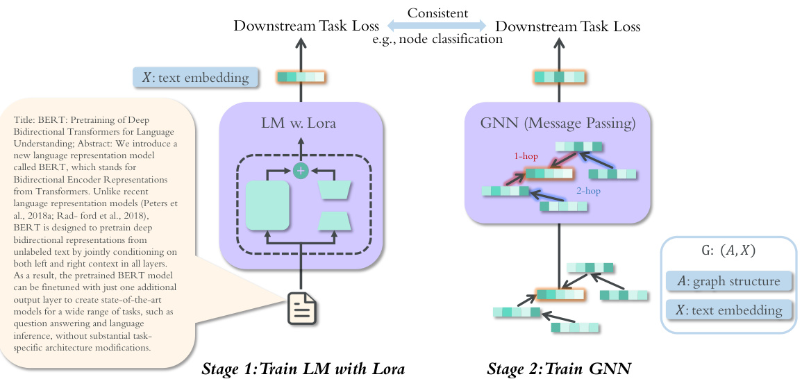 Figure 1: The overview of SimTeG. In stage  $I$  , we train a LM with lora (Hu et al., 2022) and then generate the embeddings   $\boldsymbol{X}$   as the representation of text. In stage 2, we train a GNN on top of the embeddings  $\boldsymbol{X}$  , along with the graph structure. The two stages are guided with consistent loss function, e.g., link prediction or node classification.