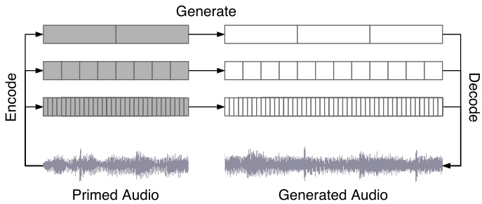 (c) Primed采样:模型可通过将现有音频信号转换为VQ-VAE编码并逐级采样后续编码,生成音频信号的延续部分。