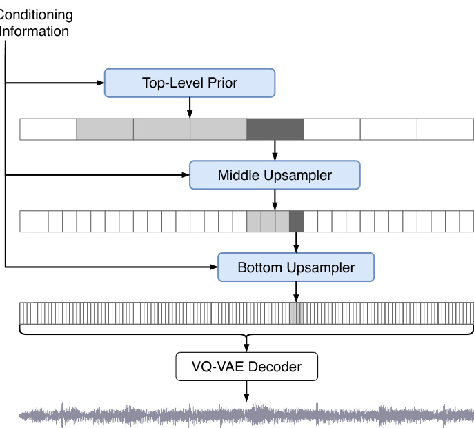 Primed sampling: Instead of sampling the entire token sequence from the model, we can also run a forward pass of the VQ-VAE to obtain the top, middle, and bottom level codes corresponding to a segment from an actual song, as shown in Figure 2c. We can use these as the initial tokens in our ancestral sampling process and continue sampling from these to produce novel completions of the song.