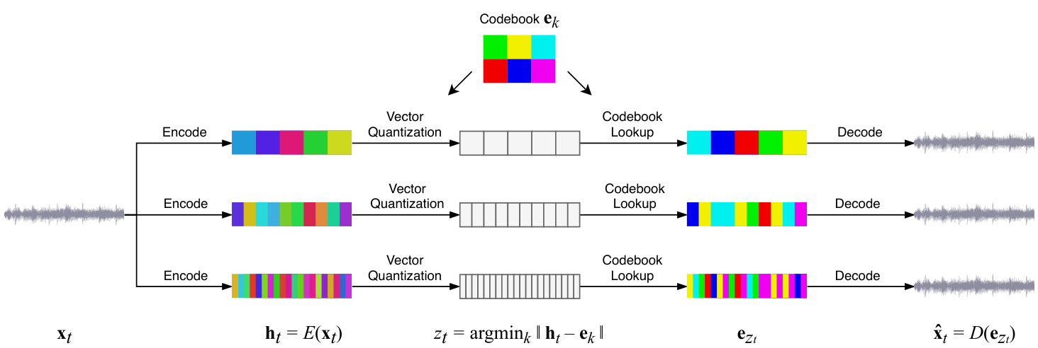 To make this task feasible, we use the VQ-VAE (Oord et al., 2017; Dieleman et al., 2018; Razavi et al., 2019) to compress rVaQw -aVuAdiEo lteoa ar nlso twoe re-ndicomdeen saino nianlp supt asceeq. uAe nocnee $\mathbf{x}=\langle\mathbf{x}_ {t}\rangle_{t=1}^{T}$ using a sequence of discrete tokens $\mathbf{z}=\langle z_{s}\in[K]\rangle_{s=1}^{S}$ where $K$ denotes the vocabulary size and we call the ratio $T/S$ des $\mathbf{x}$ into a sequence of latent vectors $\mathbf{h}=\langle\mathbf{h}_ {s}\rangle_{s=1}^{S}$ $E(\mathbf{x})$ tao biottst l nee nae rce ks tt hvaetc tqoura $\mathbf{e}_ {z_{s}}$ efsr $\mathbf{h}_ {s}\mapsto\mathbf{e}_ {z_{s}}$ bboyo km $C={\mathbf{e}_ {k}}_ {k=1}^{K}$ $\mathbf{h}_{s}$ and a decoder that decodes the embedding vectors back to the input space. It is thus an auto-encoder with a disc ret iz ation bottleneck. The VQ-VAE is trained using the following objective: