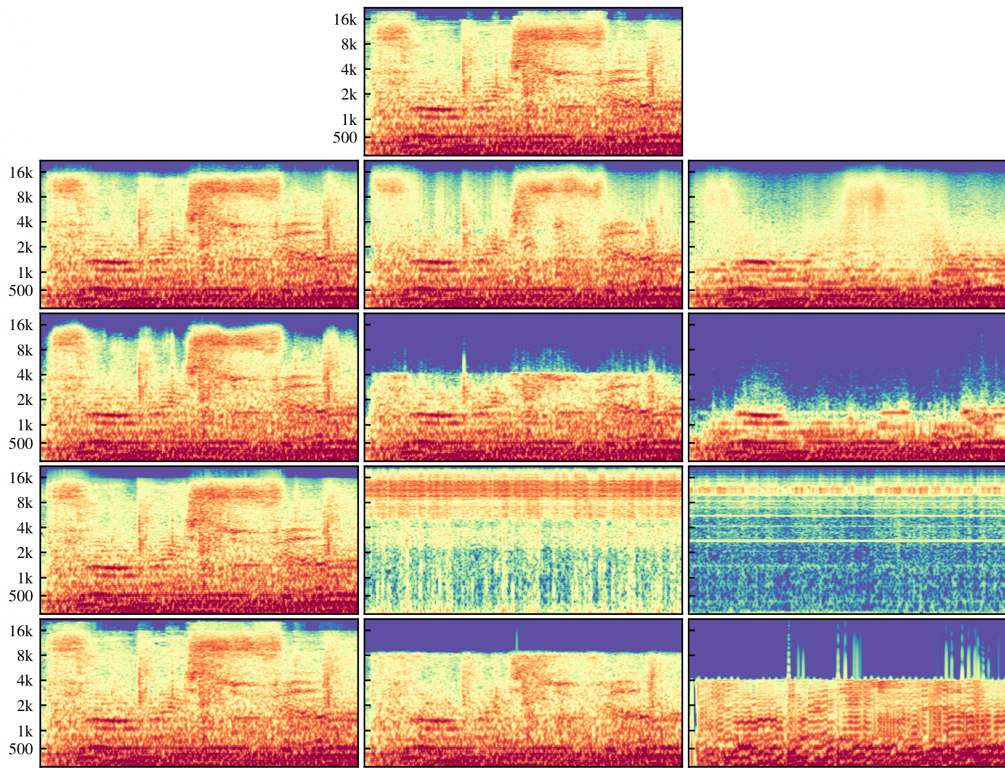 表 3: 在没有频谱损失或使用单一层次自编码器的情况下,顶层编码通常难以训练良好。重建结果可能会丢失部分甚至大部分信息。