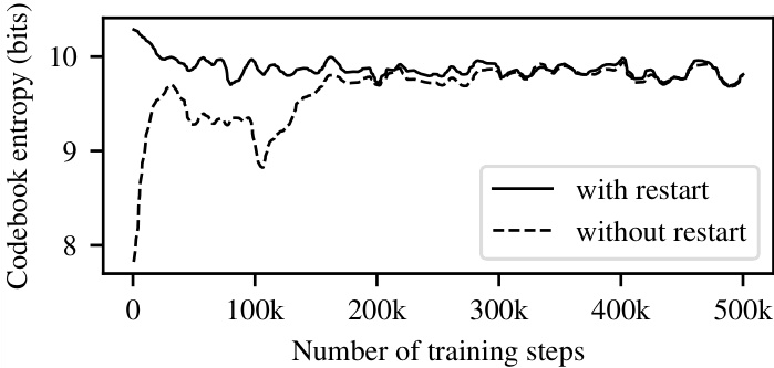 In Table 1, we see that increasing the hop size results in higher reconstruction error. Figure 4 indeed shows that a significant amount of information, especially higher frequencies, is missing at middle and top levels across all ablations we ran. This is expected as audio is compressed more with larger hop sizes. To mitigate codebook collapse, we restart dead codes near random encoder embeddings. In Figure 5, we see that this yields higher codebook usage even from early on in training. Models trained without random restarts can converge to the same test error and codebook usage but require more training steps. With poor initialization, these models sometimes end up with suboptimal codes hurting reconstruction fidelity.