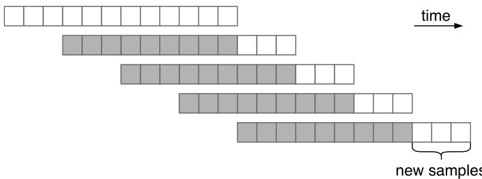 (b) Windowed sampling: To generate music longer than the model’s context length (12 in this figure), we repeatedly sample continuations at each level, using overlapping windows of previous codes as the context. The overlap amount is a hyper parameter, and the figure shows an example of $75%$ overlap with hop length 3.