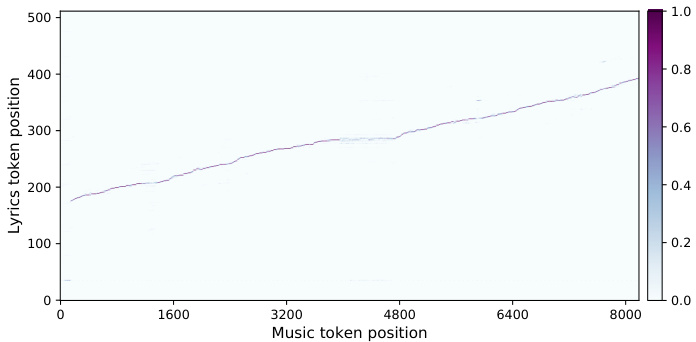 图 3: 由某个编码器-解码器注意力层学习到的歌词-演唱对齐关系。横轴 ($_x$ 轴) 表示音乐查询的位置,纵轴 ($y$ 轴) 表示歌词键的位置。解码器所关注的位置对应正在演唱的字符。