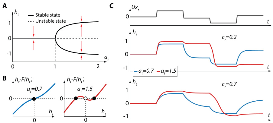 图 2C 展示了 BRC 相对于 $a_{t}$ 和 $c_{t}$ 的动态变化。当 $a_{t}<1$ 时,细胞表现出经典的单调稳定行为,在没有输入的情况下会弛豫到 0 稳定状态 (图 2C 中的蓝色曲线)。另一方面,当 $a_{t}>1$ 时可以观察到双稳态行为:细胞会根据过去的输入稳定在上稳定状态或下稳定状态 (图 2C 中的红色曲线)。由于这些上稳定状态和下稳定状态不对应于 $h_{t}$ 等于 0 的情况,因此它们可以与永不随时间消退的细胞记忆相关联。此外,图 2 还说明了神经元收敛动态取决于 $c$ 的值。