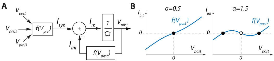 Figure 1: A. One timescale control diagram of a neuron. B. Plot of the function  ${I_{i n t}=V_{p o s t}-}$   $\alpha\operatorname{tanh}(V_{p o s t})$   for two different values of   $\alpha$  . Full dots correspond to stable states, empty dots to unstable states.