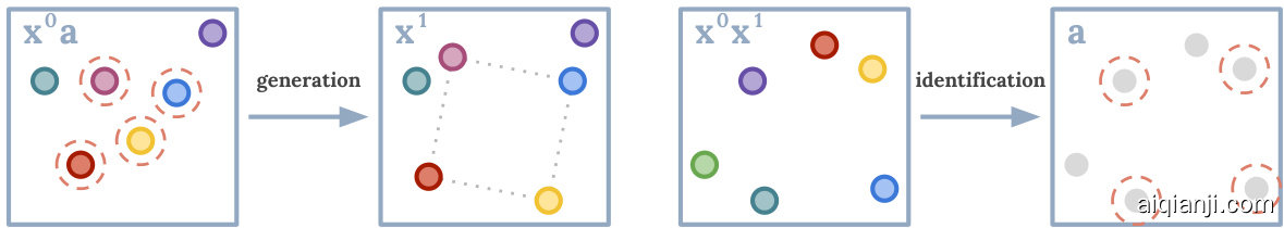 图 1: "方形"概念的生成与识别过程示例。a) 给定初始状态 $\mathbf{x}^{0}$ 和注意力掩码 a,通过优化 $\mathbf{x}^{1}$ 形成由 a 中实体组成的方形。b) 给定状态 $\mathbf{x}$ ,通过优化注意力掩码 a 找到构成方形的实体。